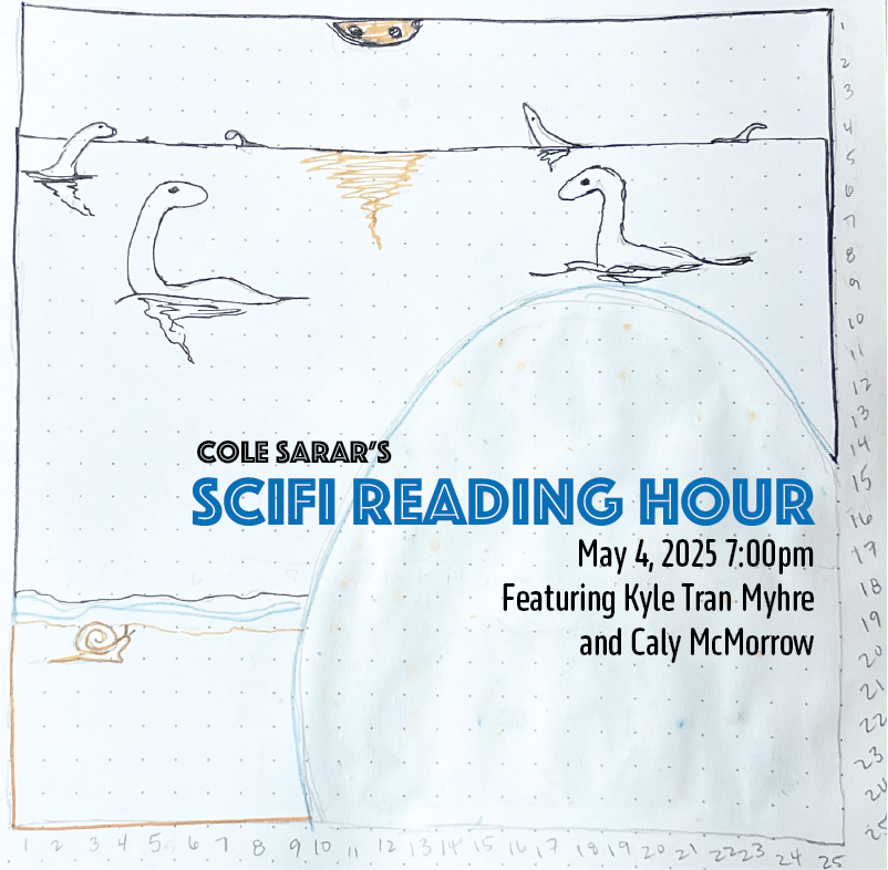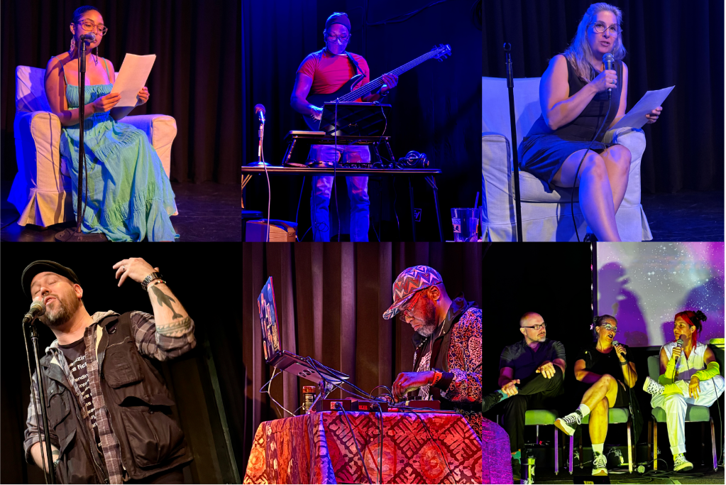 Conceived and launched in 2019, the thesis of my SciFi Reading Hour was to put more stories of the future by more local writers in front of the eyes of the community. The elevator pitch is this: We need more women, more people of color, more immigrants and queer folk writing the future, so that someone else isn’t writing us out of it, or writing our futures for us. I also think artists thrive on collaboration, and good theater is easier to come by combining talents in different media. In 2019-2020, and now again in 2025 this presents as two writers (poets, novelists, playwrights, experimental writers, others!) collaborating with one musician on future-looking stories on a stage (thank you Bryant Lake Bowl!).